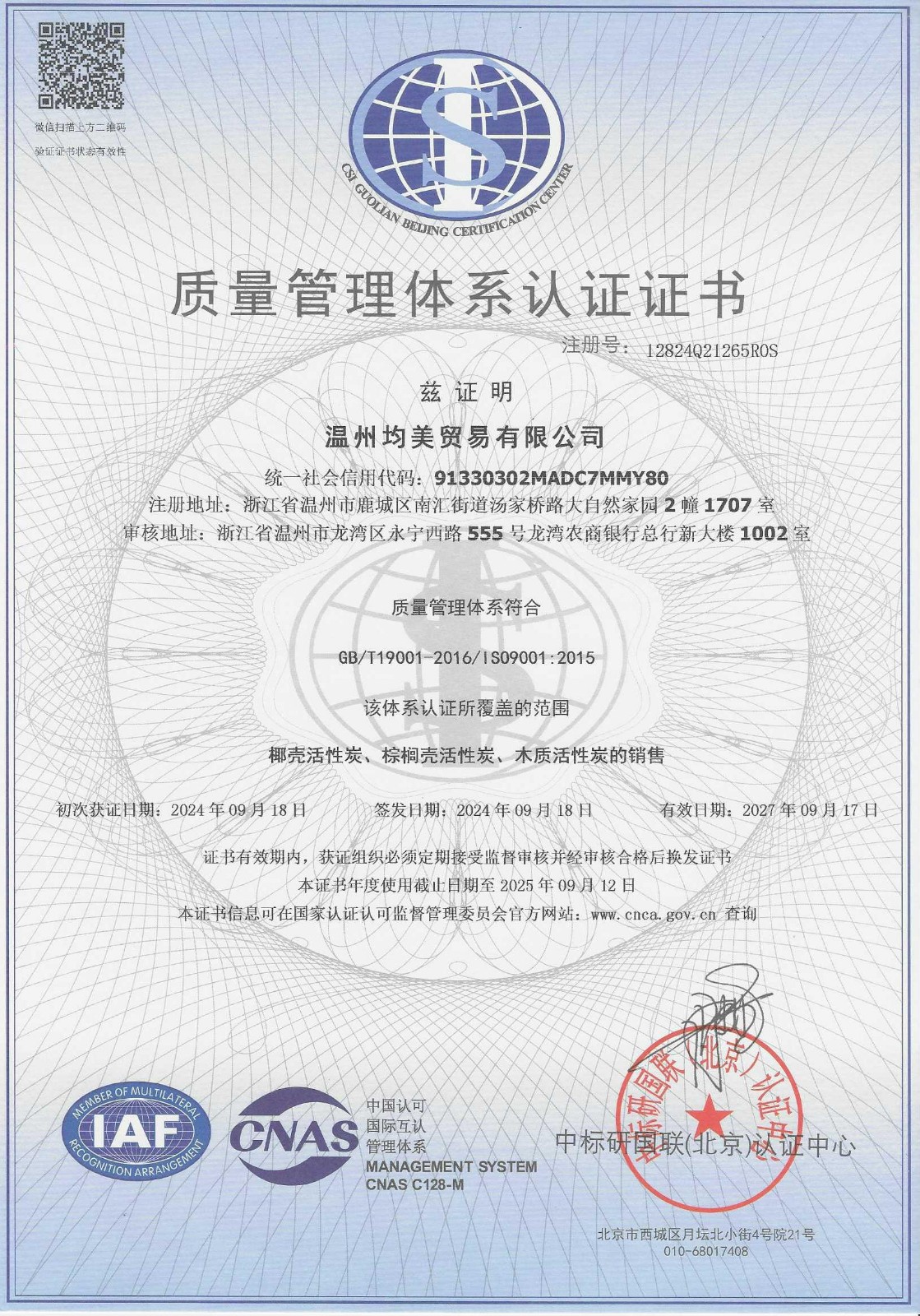 质量管理体系认证证书